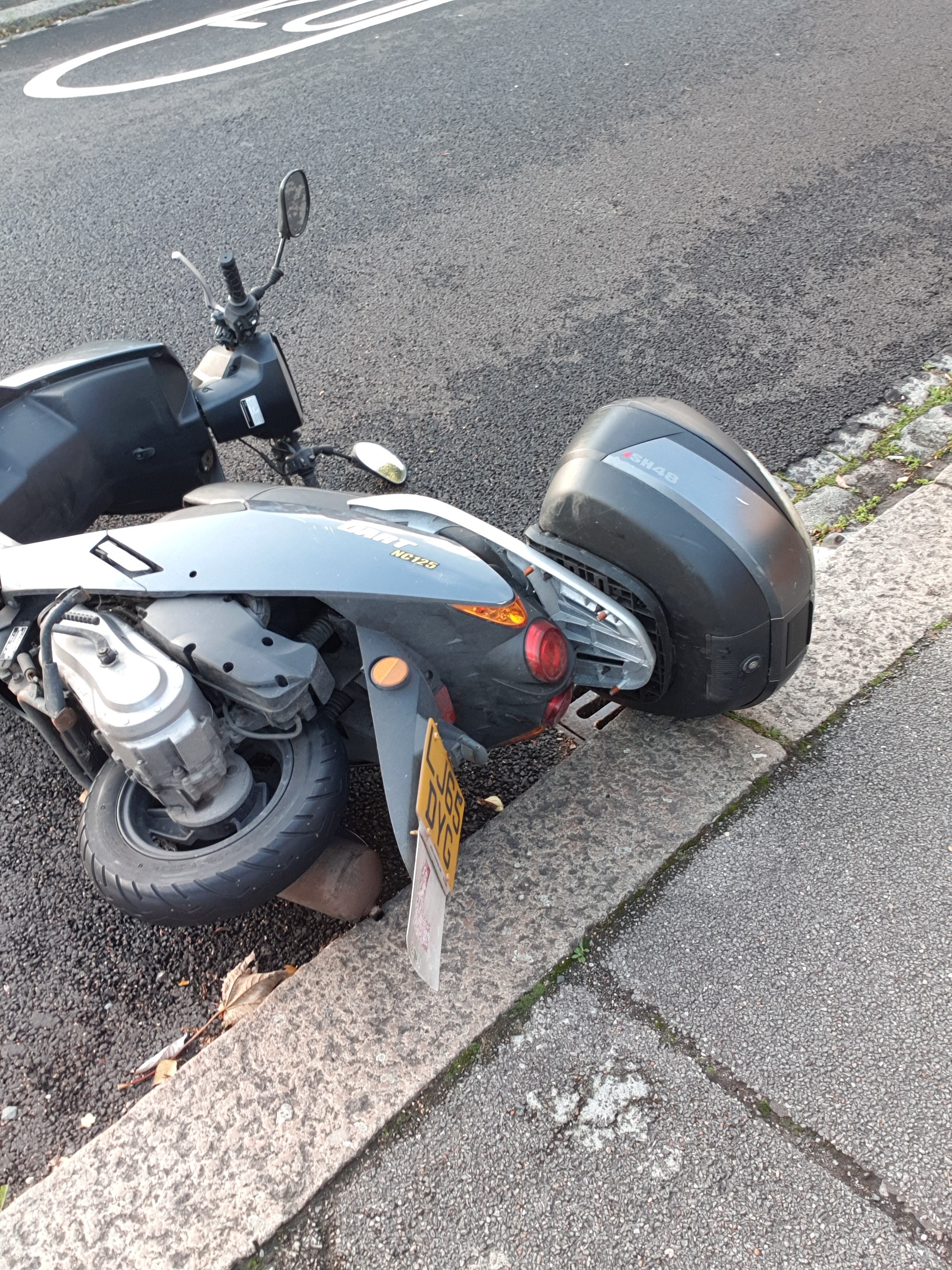 It’s now upright again, with the front wheel padlocked. That doesn’t suggest to me that someone’s just dumped it and left it there.