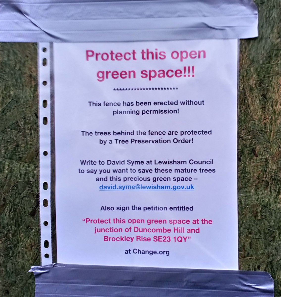 Does anyone know the status of the tree preservation order that was placed on the trees there? Also does anyone know if there has been planning application for the fence that is going up today? I think that you have to have planning for a fence over 1m high by a road. It does look to me like the very high fence will make it very difficult for cars to safely turn out of Duncombe Hill as the road sort of curves.