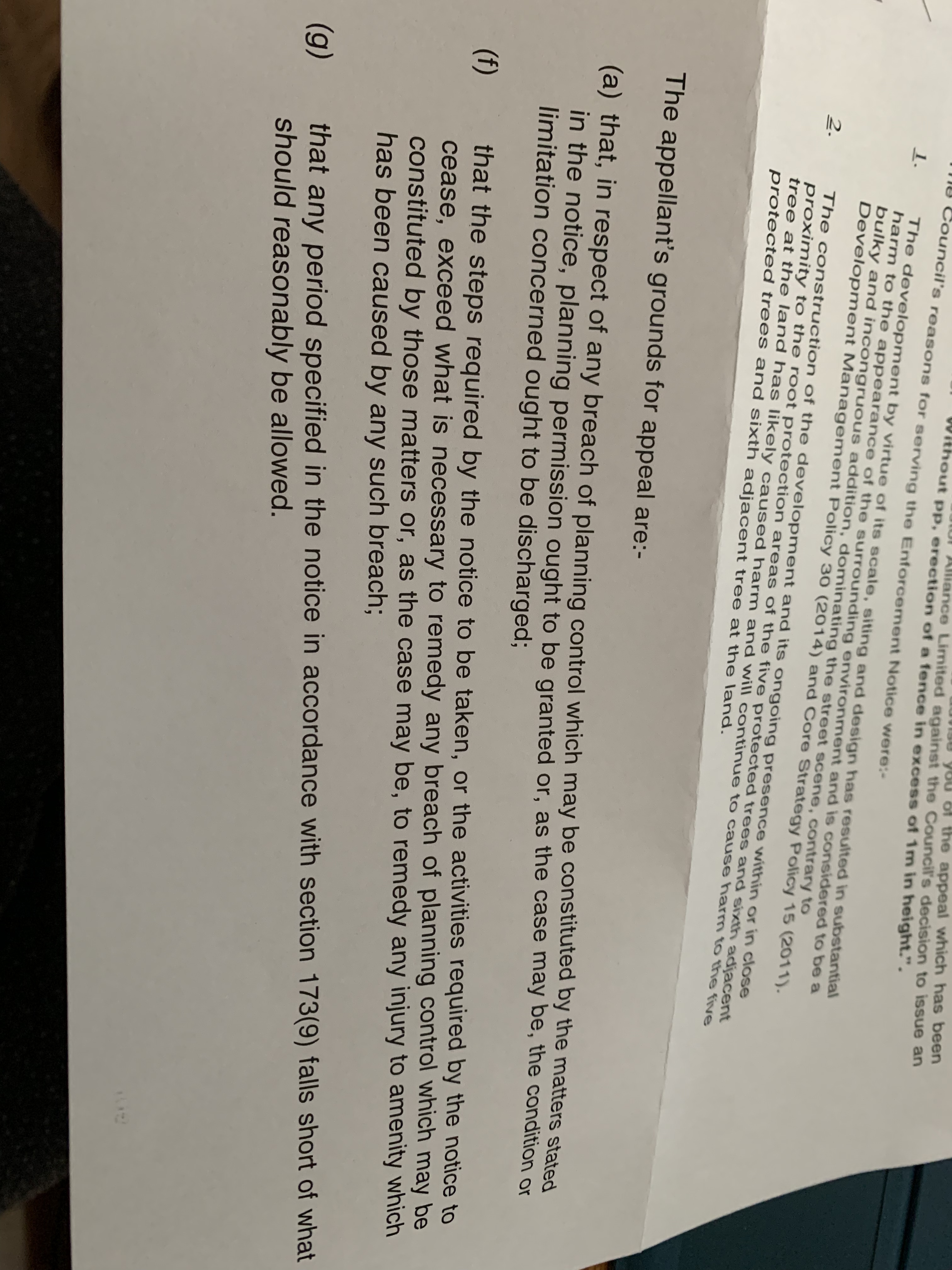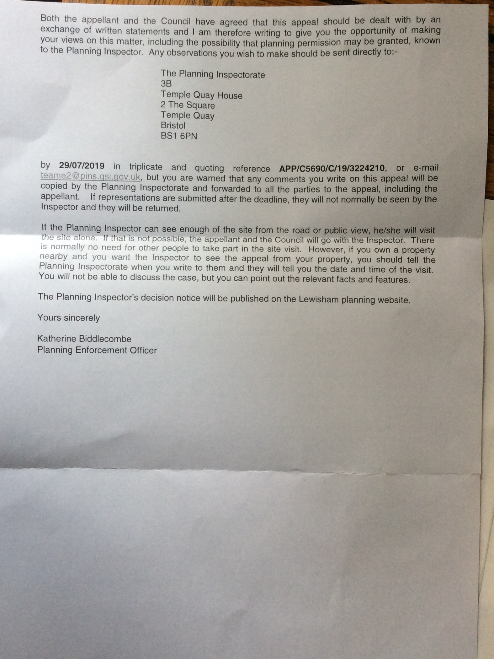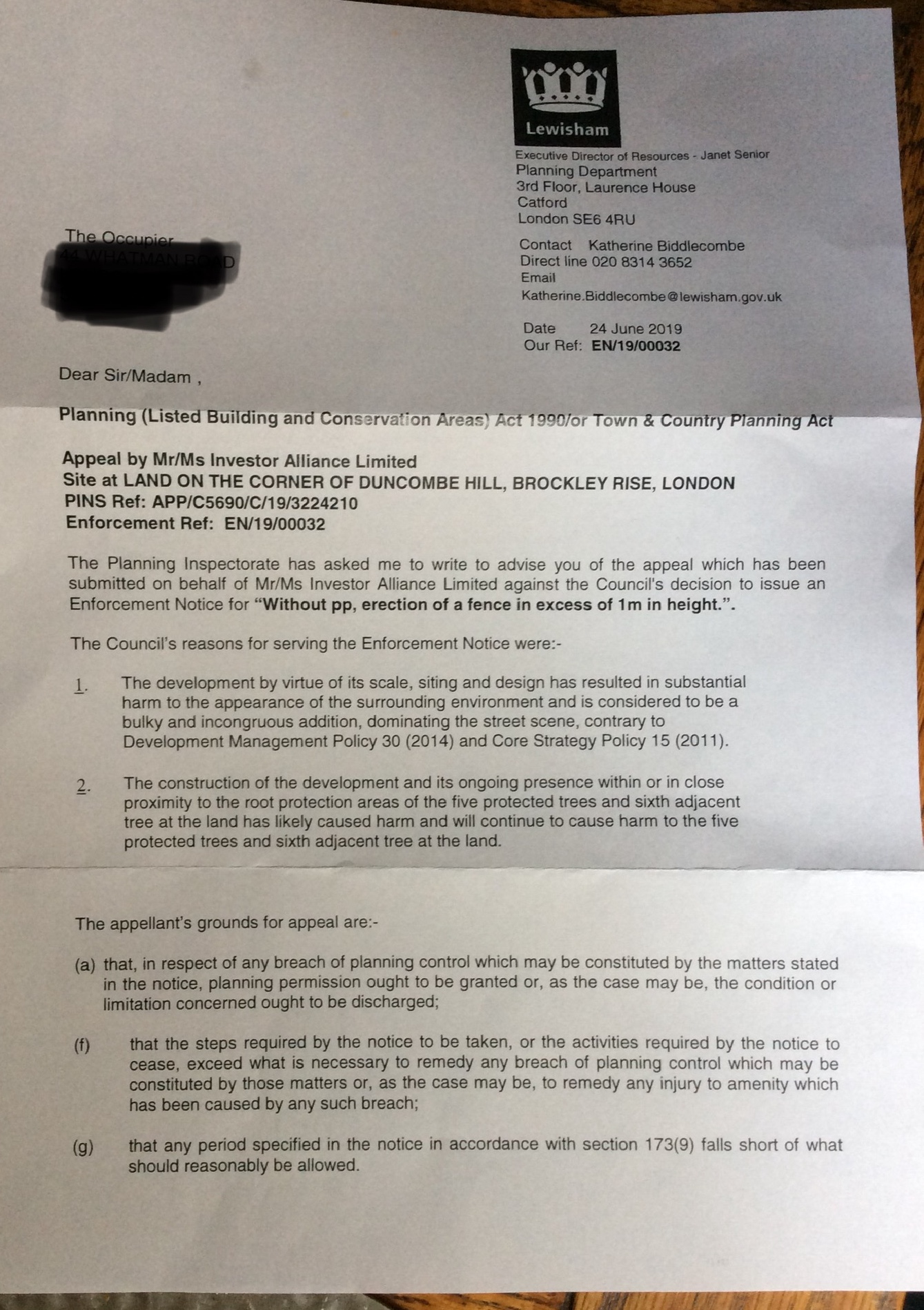 The developers seem to be appealing against the enforcement notice for the erection of the fence. I assume I got a letter as I objected to the planning application- or have the council mailed all local residents? Does anyone understand the grounds for objection made by the developer (attached) and I assume ‘making your views on this matter to the planning inspector’ relate to the fence or is it the wider planning application too?