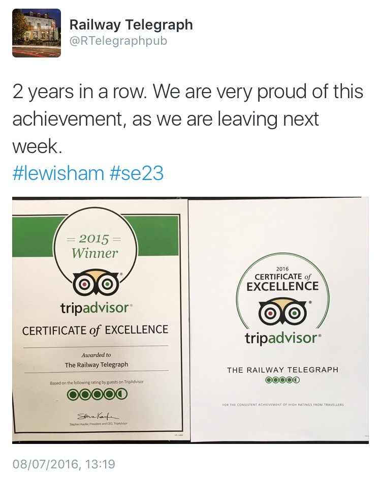 Fyi the current tenants of the railway telegraph leave at the end of june. Very sad to see them go, think the pub should have been busier than it was, but encourage you all to go before they leave! Lovely garden and terrace too.