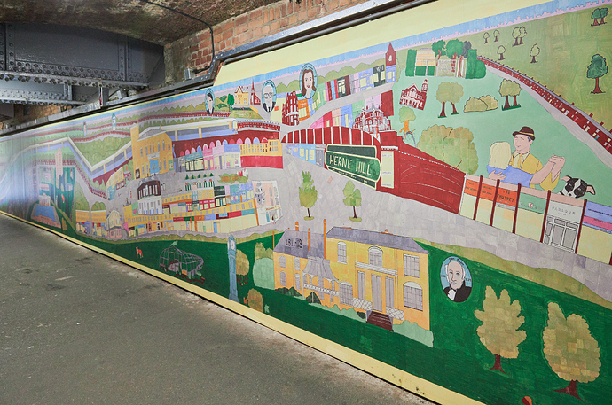 As previously mentioned, I remember when Herne Hill underpass was grotty and a place to be avoided. A recent visit and their mural still looks colourful and inviting. Any tagging get’s cleaned up by local effort (as does the tagging on the current blank dreary FH underpass)