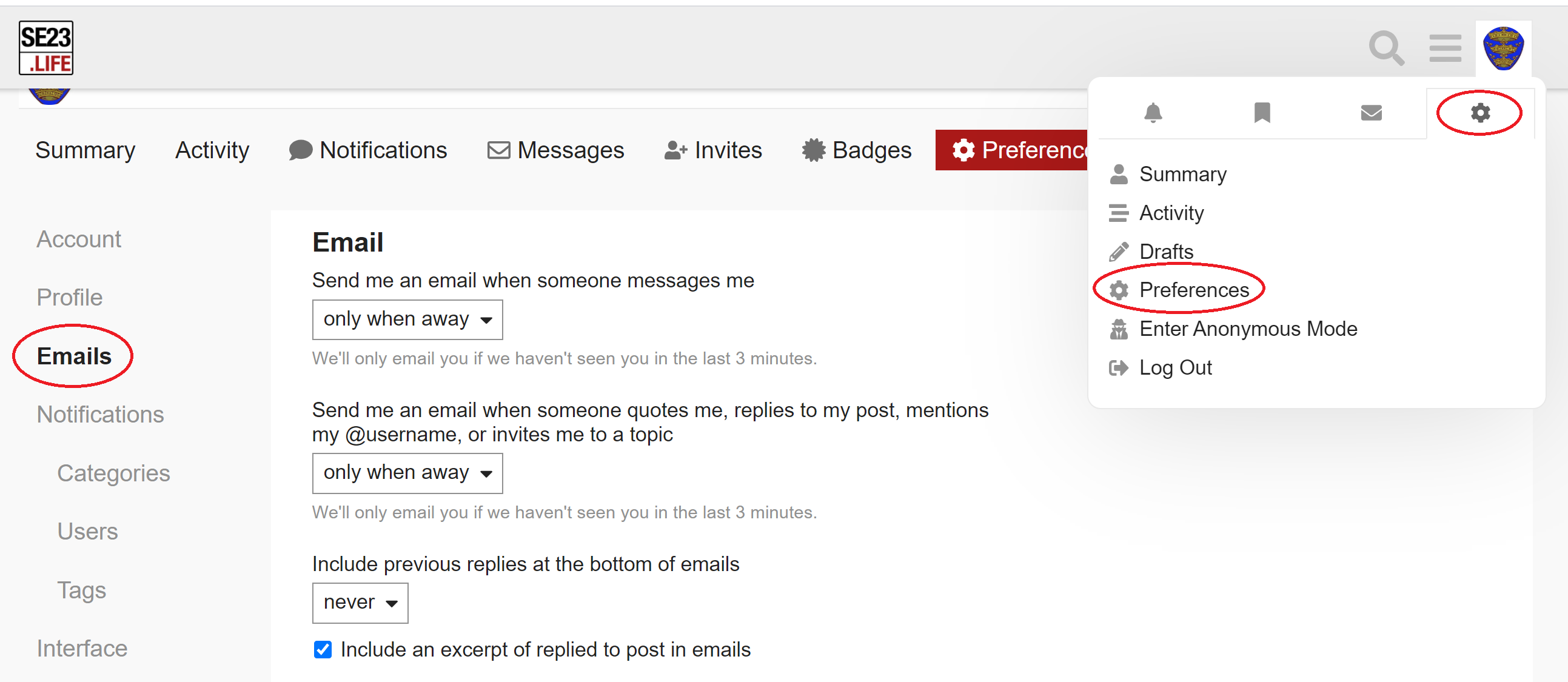 As a final note, if you find the site is sending you too many emails, the settings can be changed by clicking your user icon at the top-right of any page, clicking the cog icon, then selecting Preferences. The Emails section of the Preferences then allows you to change when emails will be sent: