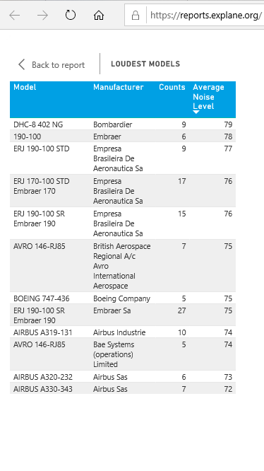 A database report on which planes register the most noise is shown below. It is Embraer 170 and 190 - modern twin engine jets - which make the most impact here. BA Cityflyer is the airline that mainly uses these. I haven’t measured, but I agree about the twin prop aircraft. They seemed less noisy, and used to be spread around the skies over us prior to 2016, that’s why there were very few complaints to the Airport until then. Twin turboprop may be another matter - top of the table here by a small margin is a Bombardier De Havilland twin turboprop plane.