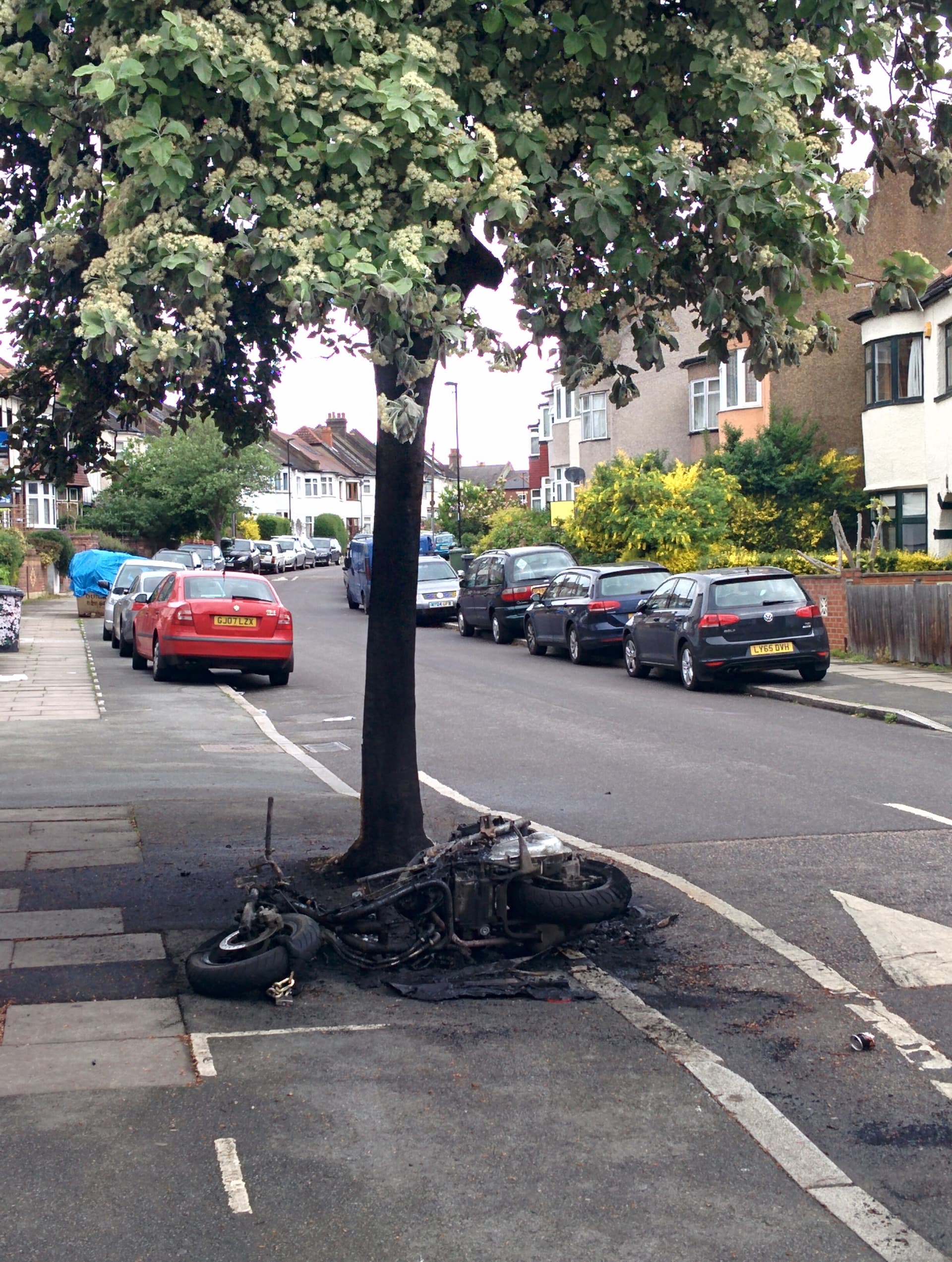 It had also lost a branch last year after a skip lorry drove through it, but apart from having lost some bark due to the moped fire you mention, it looked fine to me. It was one hell of a fire it survived too: