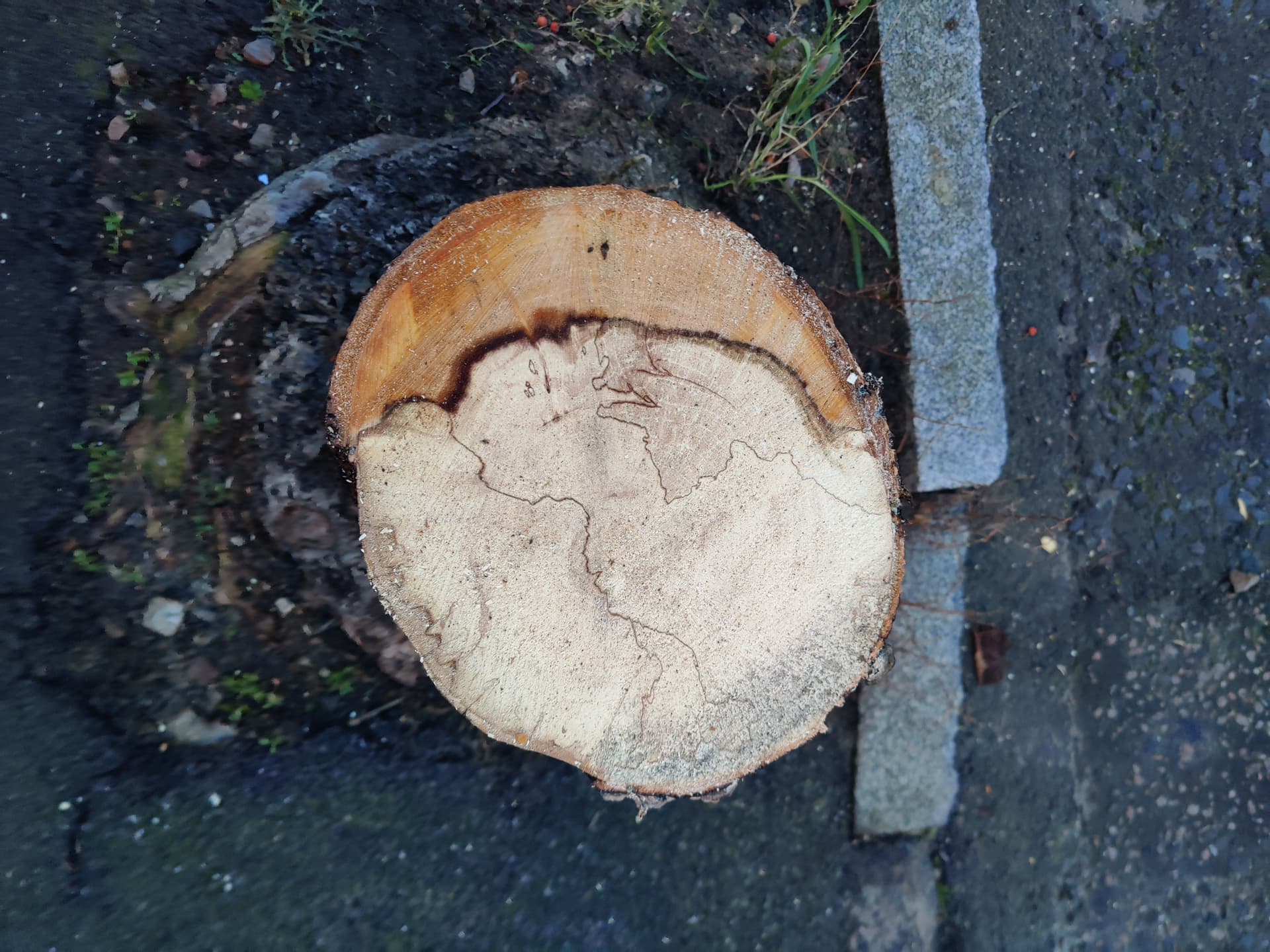 The lower side is where the fire was that had stripped the bark. I’m not sure if that being so dry and cracked is evidence that it was already dead, or the wet ‘top’ side is evidence of infection eating away at the tree. Maybe someone that knows about trees could tell something more?