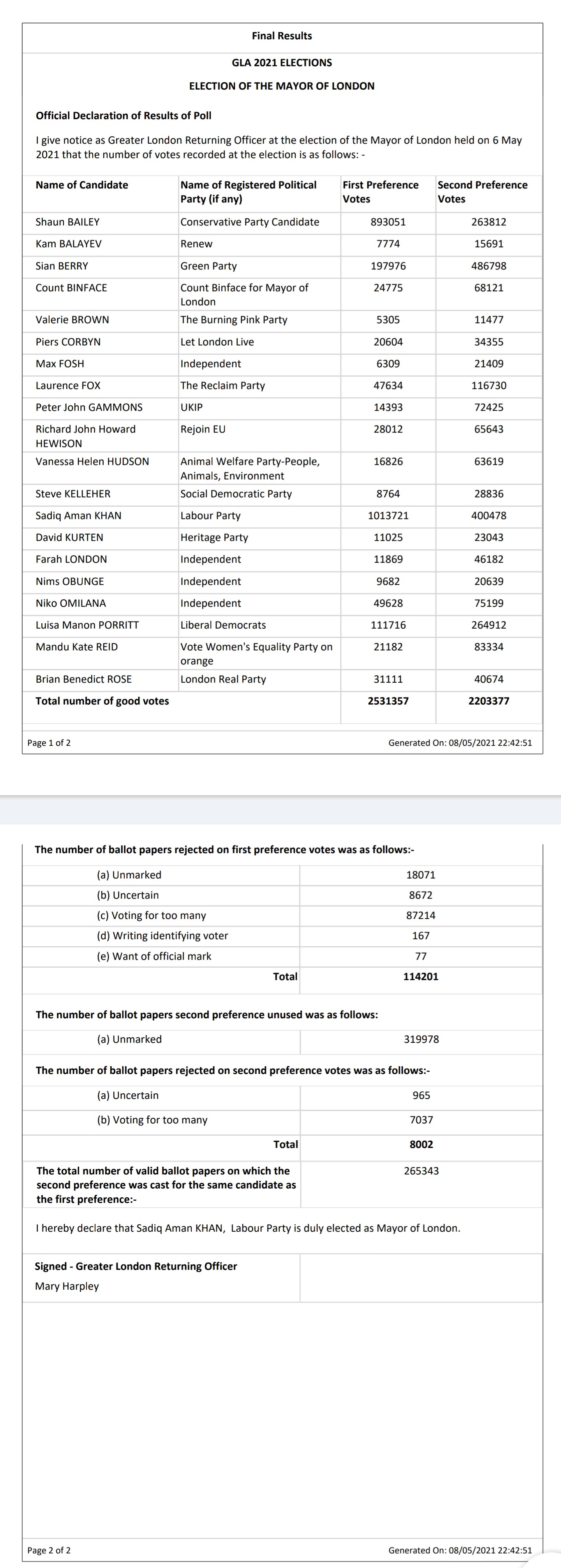 Sadiq Khan has been re-elected as London mayor with 55.2% of the vote after two rounds: