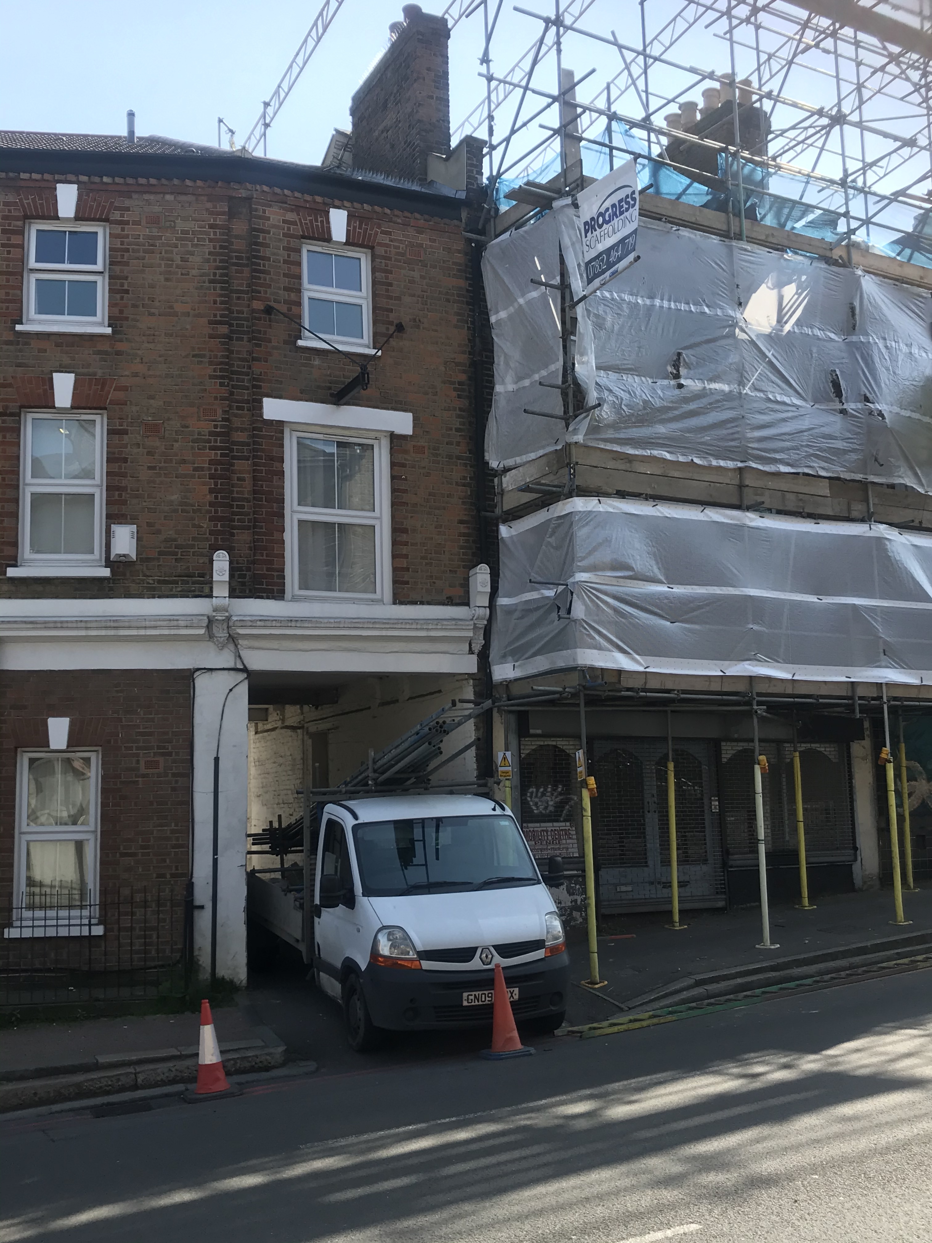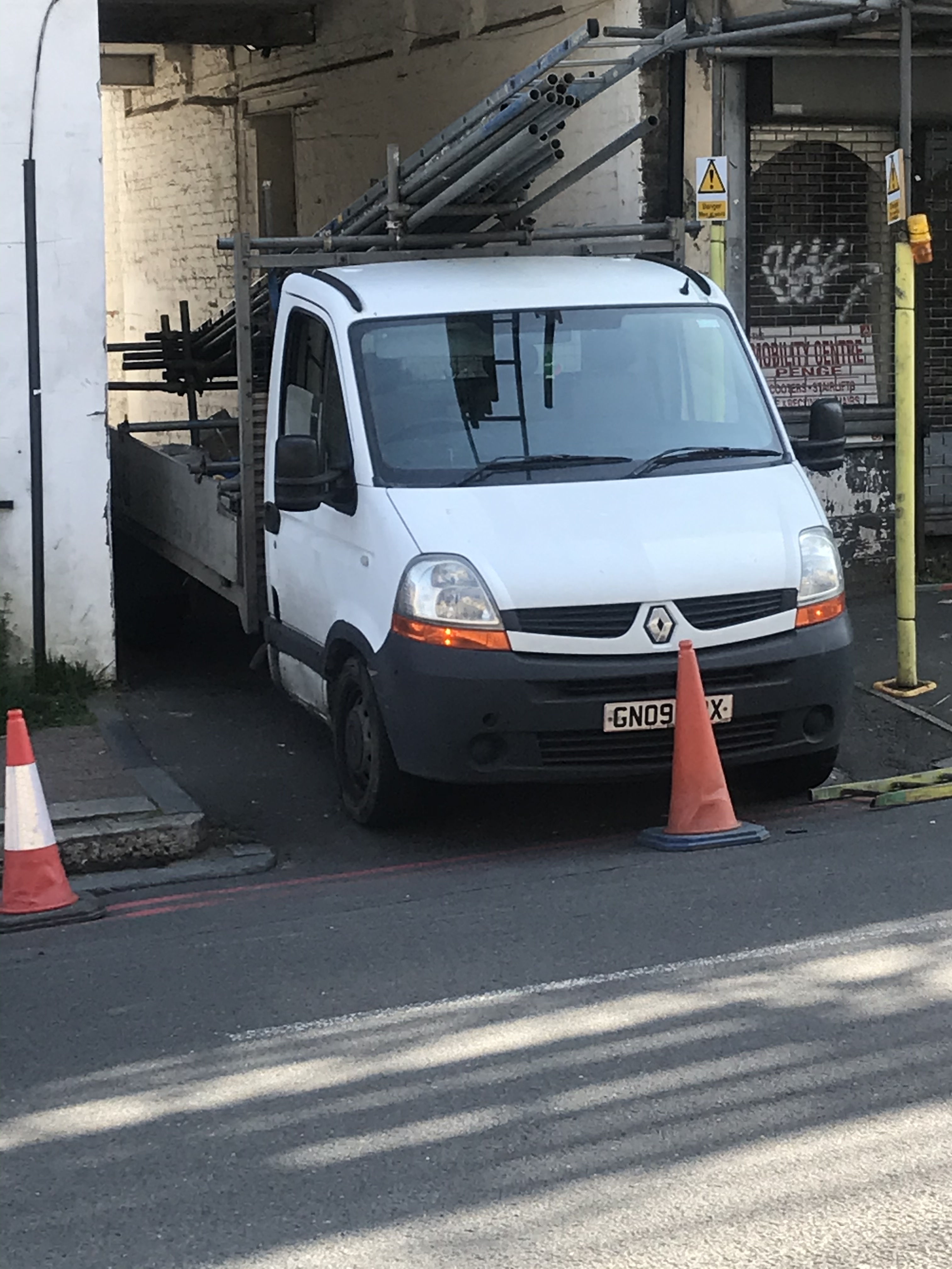 Scaffolder truck blocking pavement on dangerous corner of south circular close to forest hill station