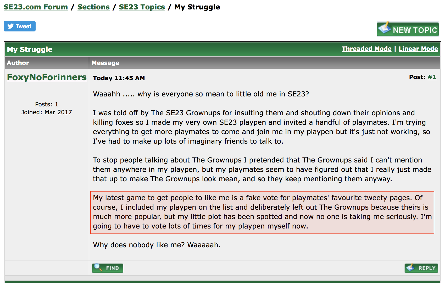 Iād forgotten to include @se23dotcom (unfortunately I donāt see their tweets anymore since they blocked me). The omission seems to have caused a bit of upset over on TOSS (see below) and Iāve now added their account to the nominations list. Sorry Steve!