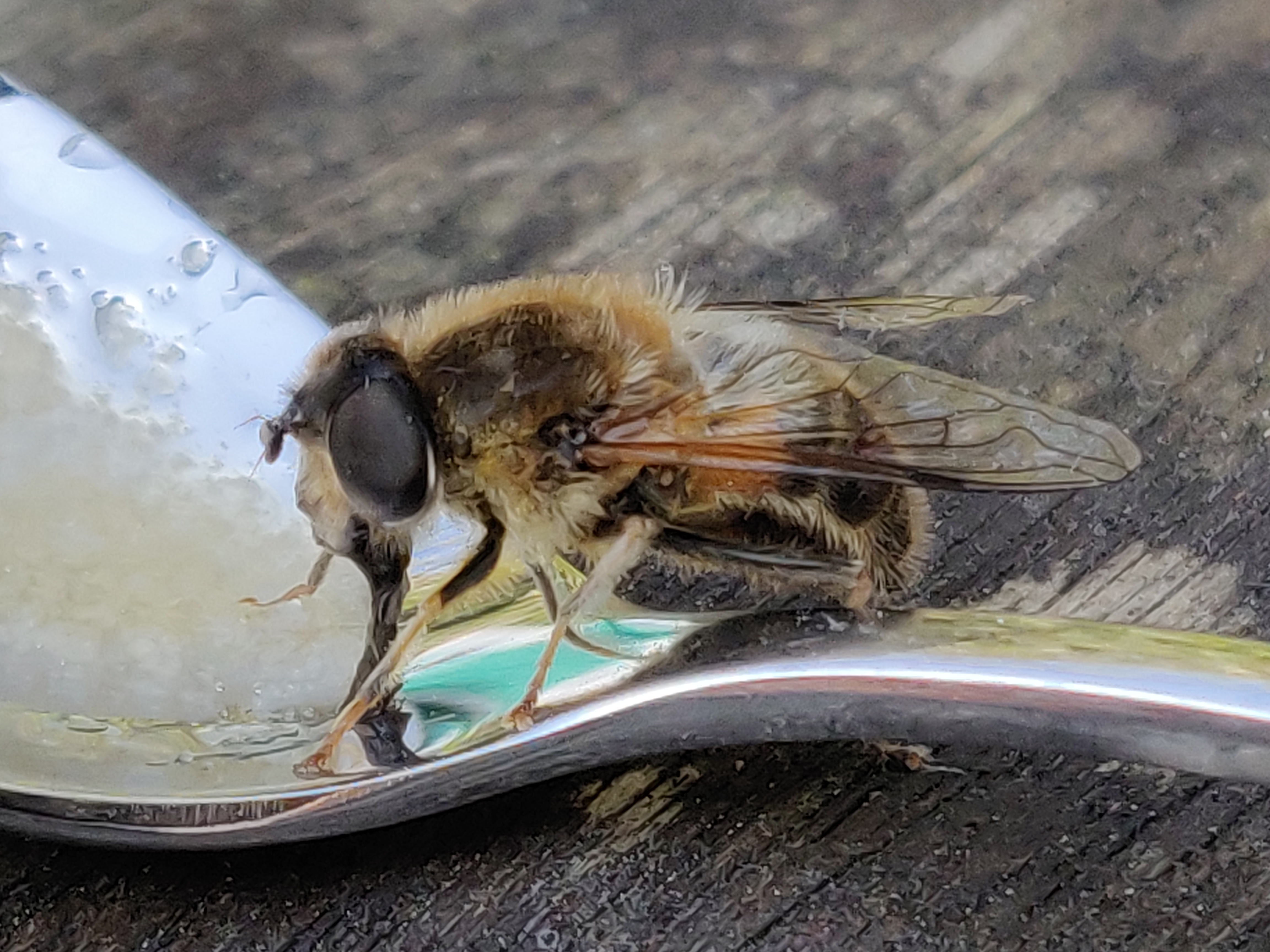 You inspired to save one today also. It got stuck in my pop up greenhouse and had stopped flying around. Managed to move it onto the spoon without it going off, where like yours it fed and then flew off replenished. I love having bees and hover flies in the garden.