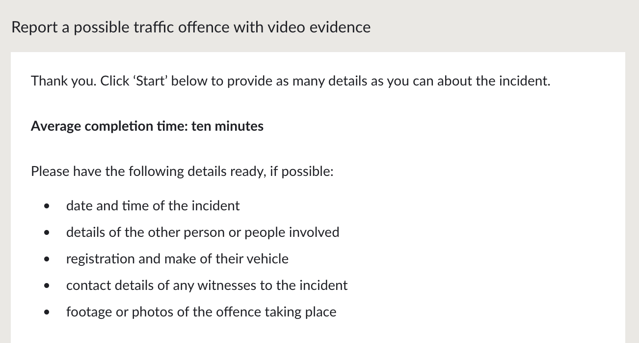 That precludes you from having a private speed camera of any kind on your street (similar to my photographic experiment above) - you’d literally have to follow someone for almost 5 minutes to submit any kind of evidence.