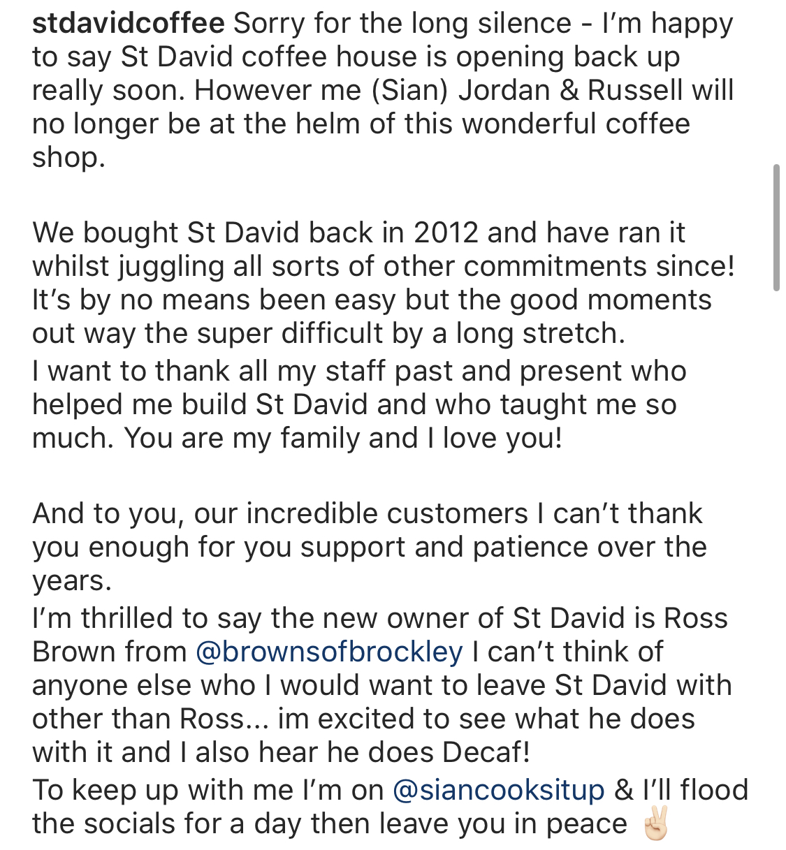 St David is a wonderful coffee shop and I wish Sian and her team the best. Also, good luck to Ross.