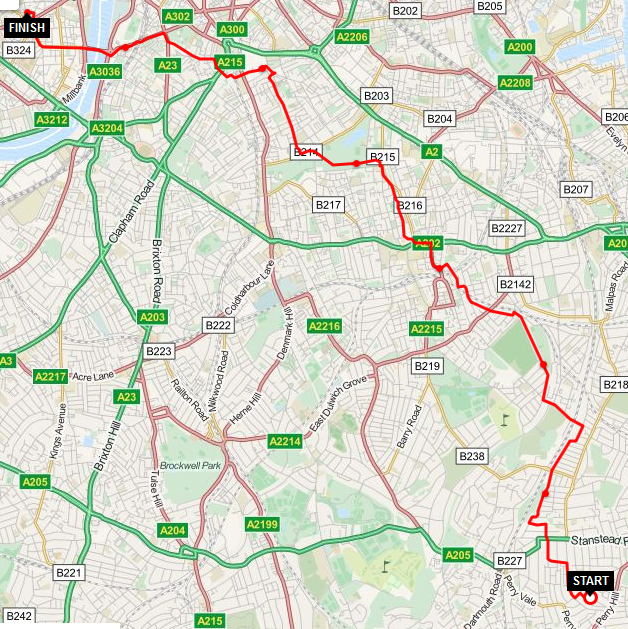 Forest Hill -> Honor Oak Park -> Peckham -> Camberwell -> Oval -> Vauxhall -> across Lambeth Bridge -> Charring Cross -> Soho -> Oxford Circus