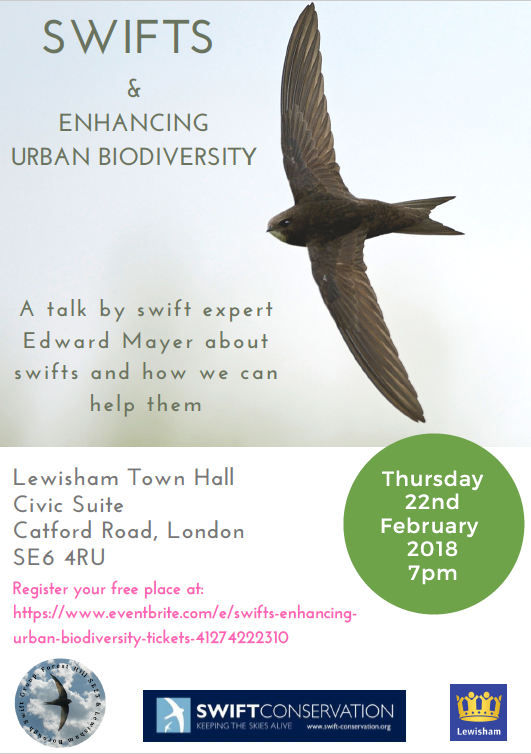 I am pleased to say that we have now organised a talk about swifts and enhancing our urban biodiversity for February. This event will be hosted in partnership with Swift Conservation UK and Lewisham Council.