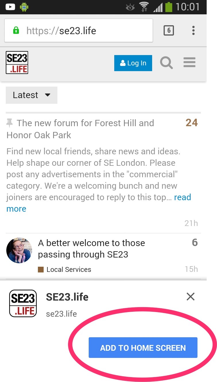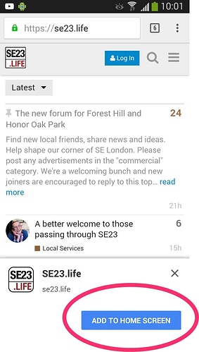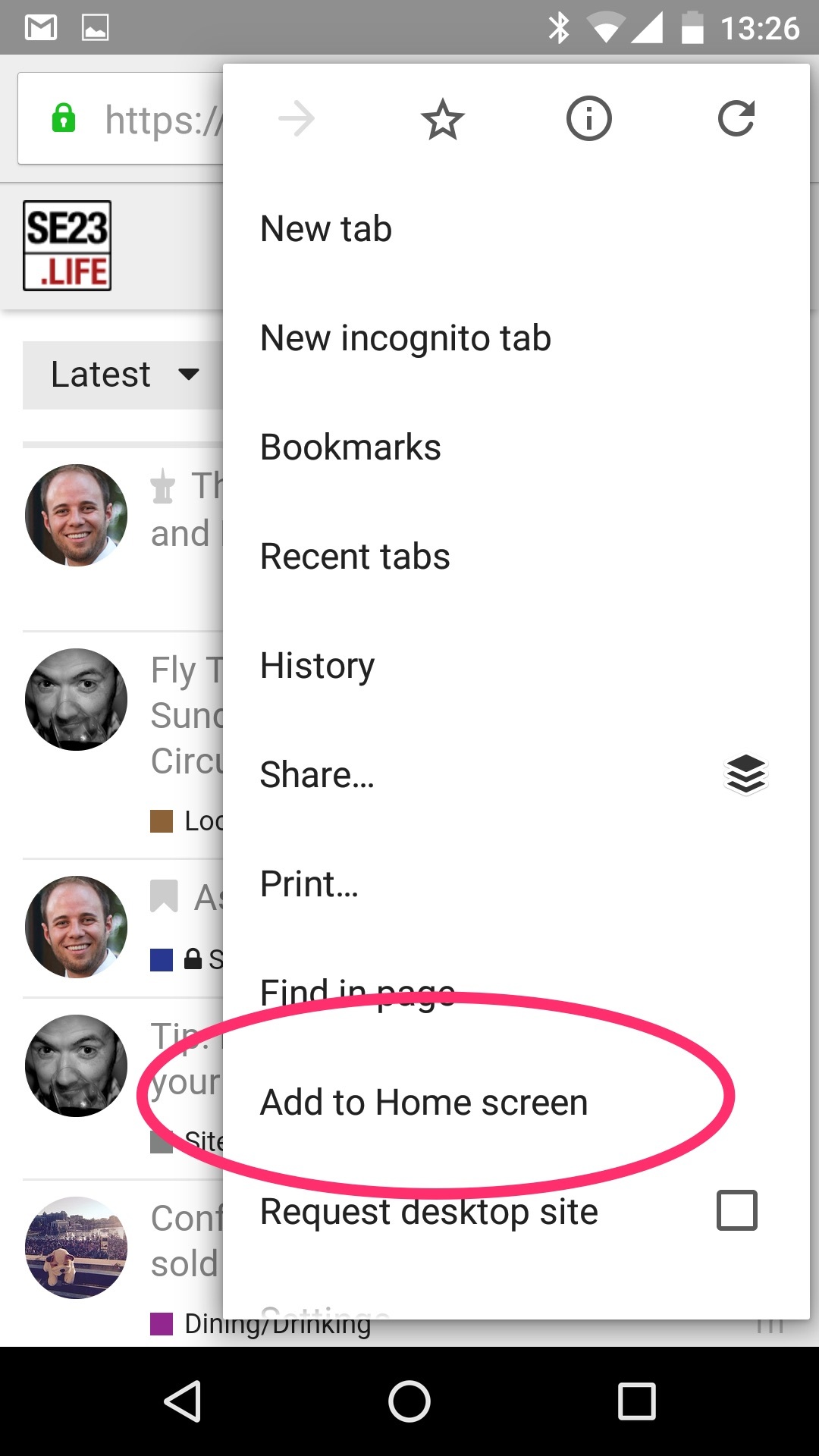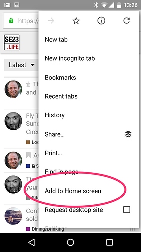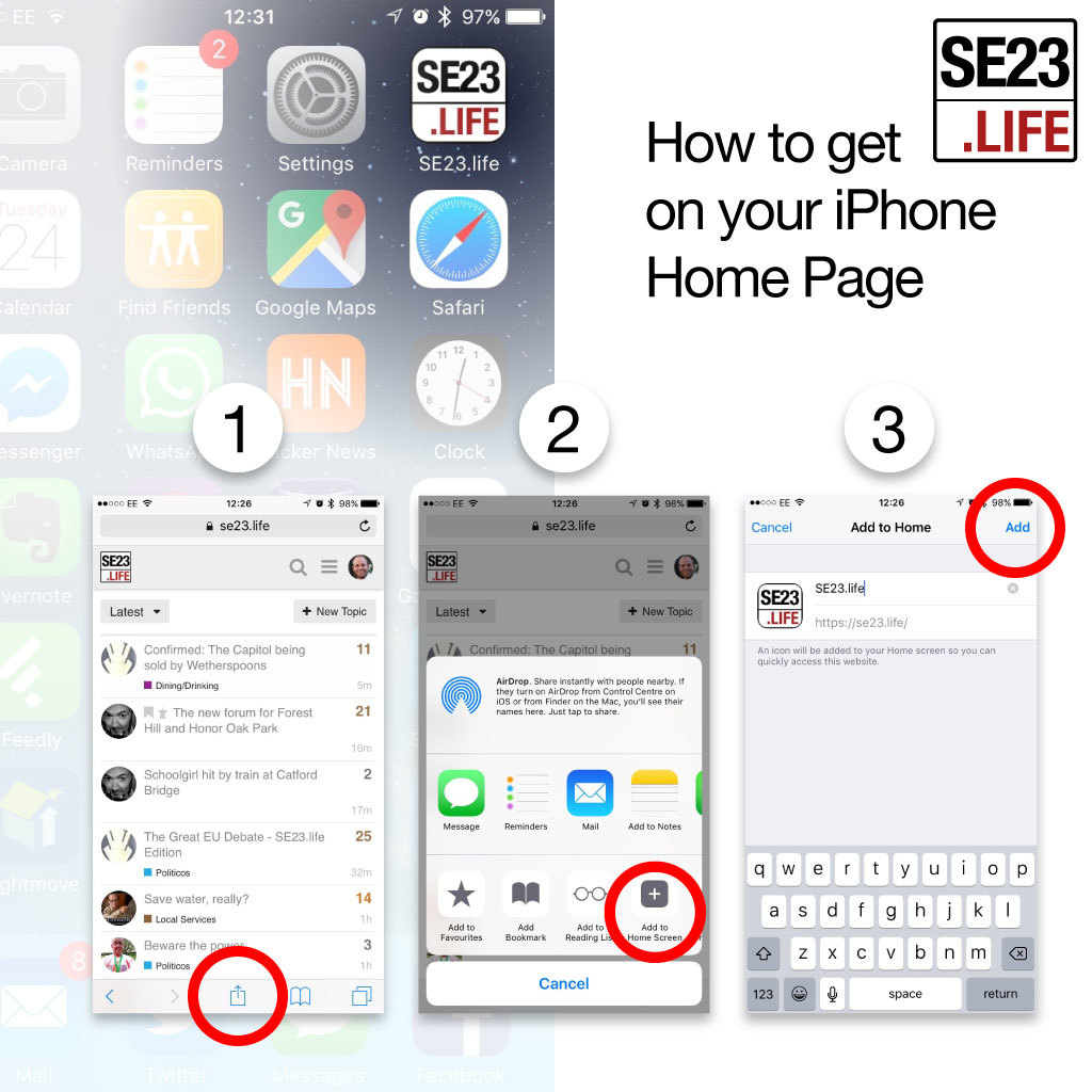 - Load the site in the browser by going direct to http://se23.life - when the site loads, click on the menu button in the navigation bar (âthree dotsâ in top right) and you will get the menu. Select âAdd to Home screenâ
