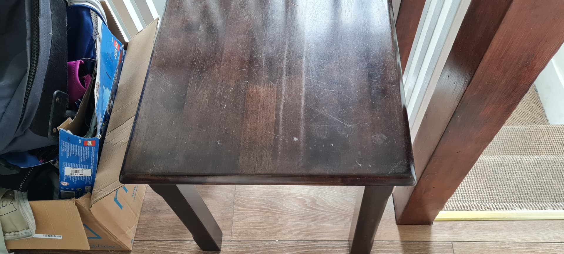 Table has surface scratches but has served as a table for my record player for years. It is made of solid wood and I can stand on it without it wobbling - it’s solid.