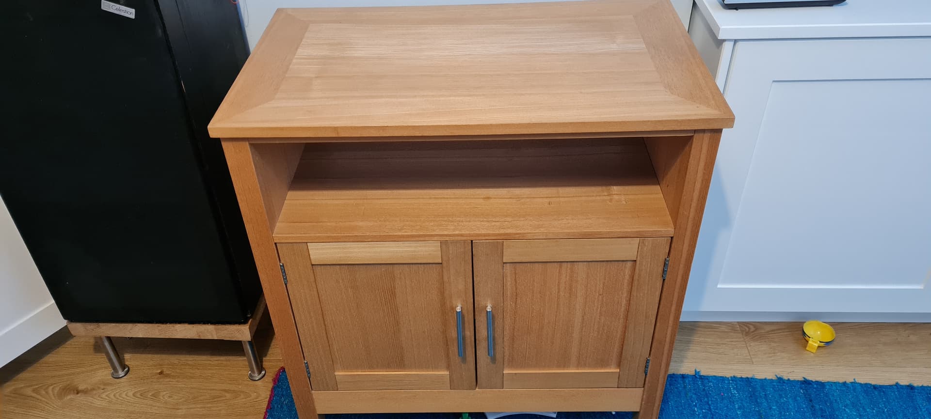 TV cabinet in pretty good condition. There are a few scratches on the internal shelf inside the door but you will put something over this.