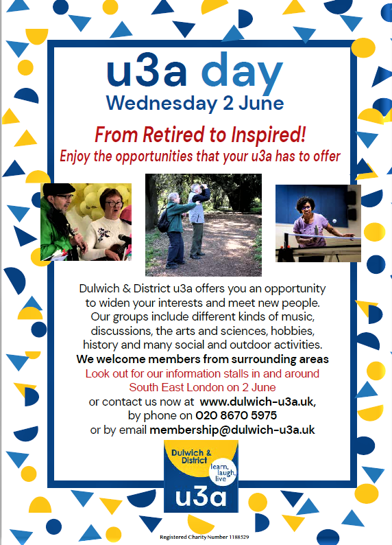 Visit our stands at Brockwell Park, Dulwich Picture Gallery, Windrush Square, Forest Hill Library, Peckham, on u3aDay, 2nd June.