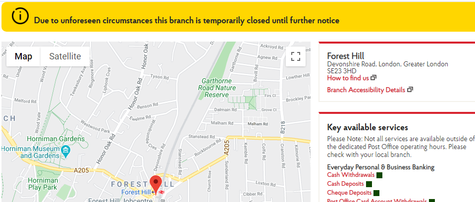 I’ve just seen a post on another local forum advising Forest Hill Post Office is temporarily closed! When I’ve checked the Post Office website it does indeed show the branch as closed: