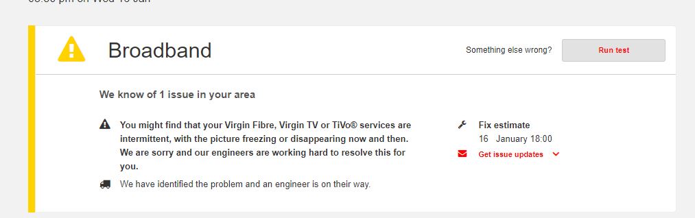 Status on the My Virgin Media page was that it is a known fault and that an engineer was on the way to fix it by 02:40. Sadly, this status hasn’t changed for 12 hours.