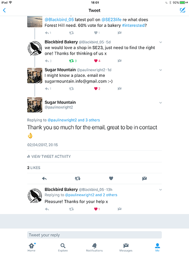 I’m now in email contact with Blackbird Bakery & have gave a couple of suggestions & contacts, so