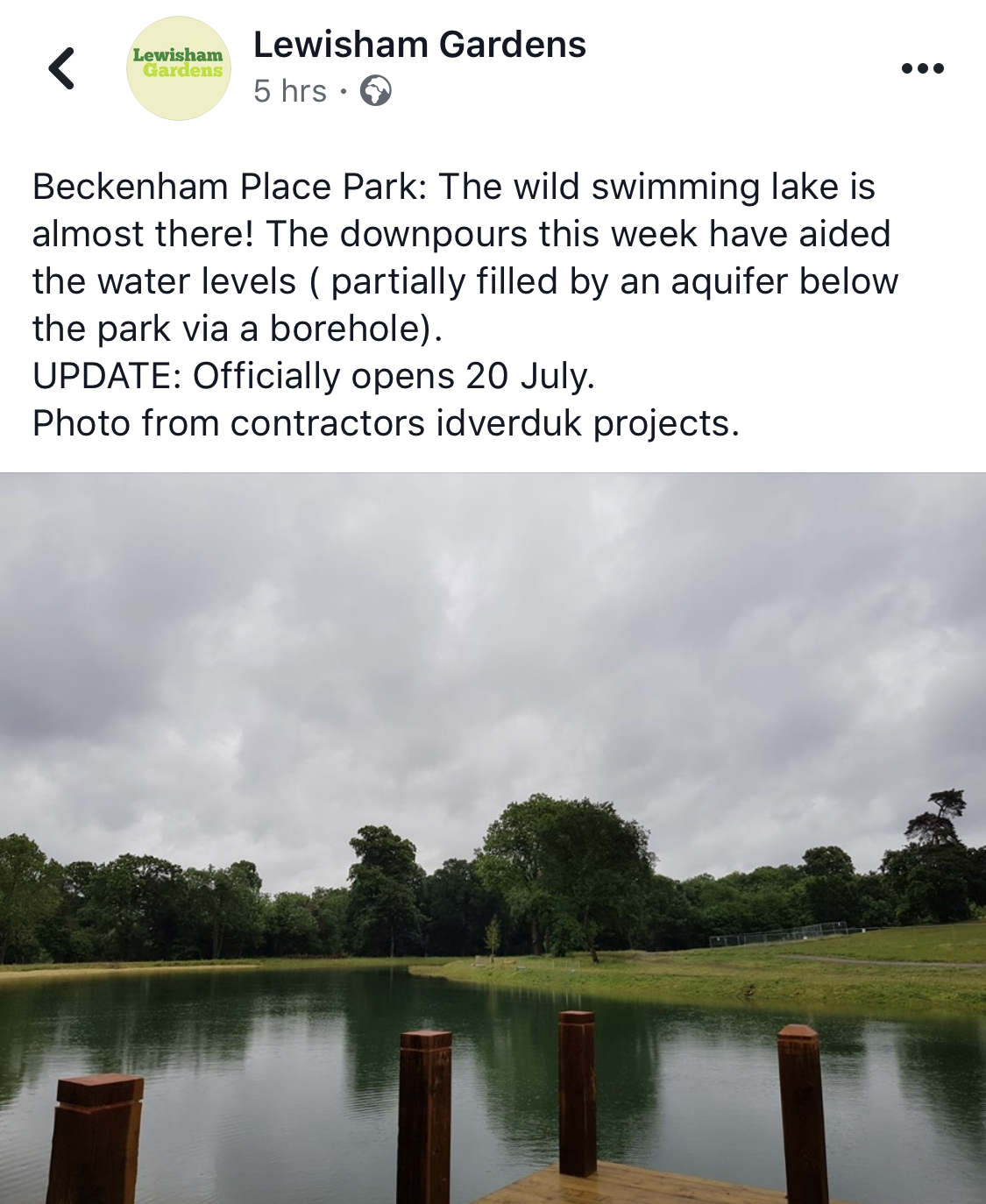 I’ve just read this morning that Beckenham Place Park is to become a natural wild swimming spot . Can’t wait for this. Would have thought this would have been Bromley Borough though?