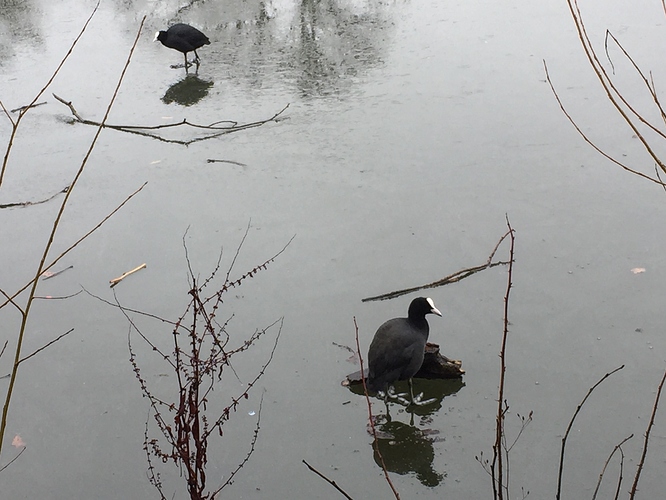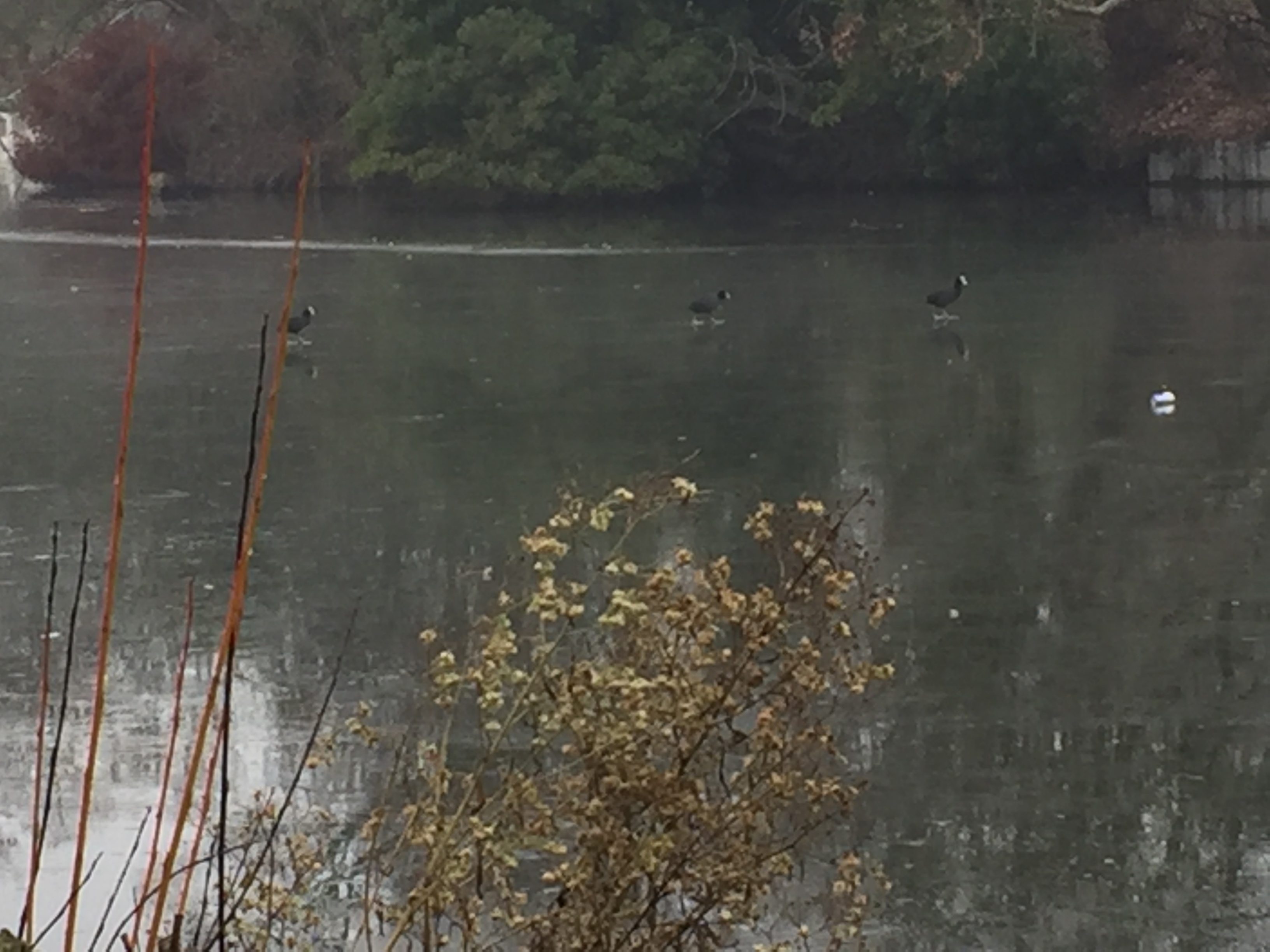 Coots ‘walking on water’ this morning, Crystal Palace Park. There was about half an inch of water hiding the ice.
