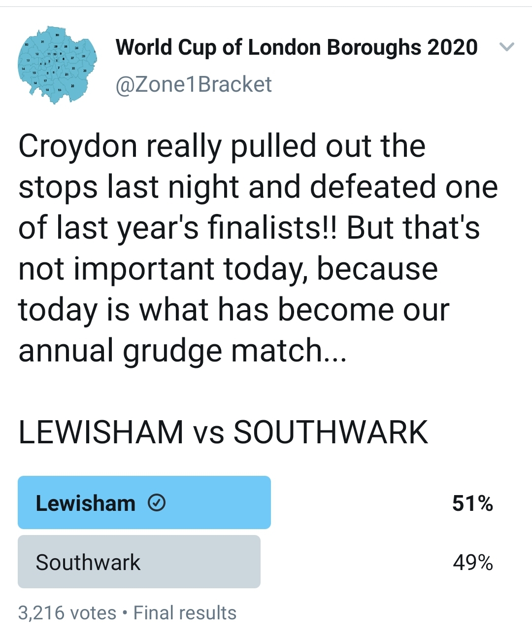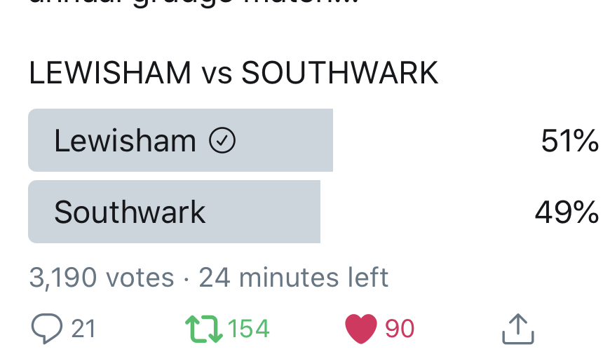 It’s the final. Lewisham v Croydon. Get voting.